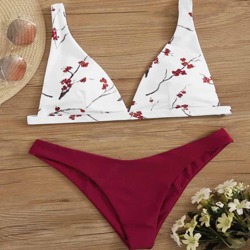 Two-piece swimsuit, plum blossom top and red nylon bottom