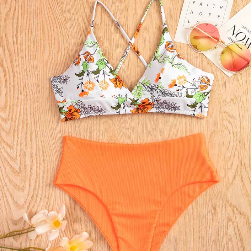 High-necked printed bikini swimsuit